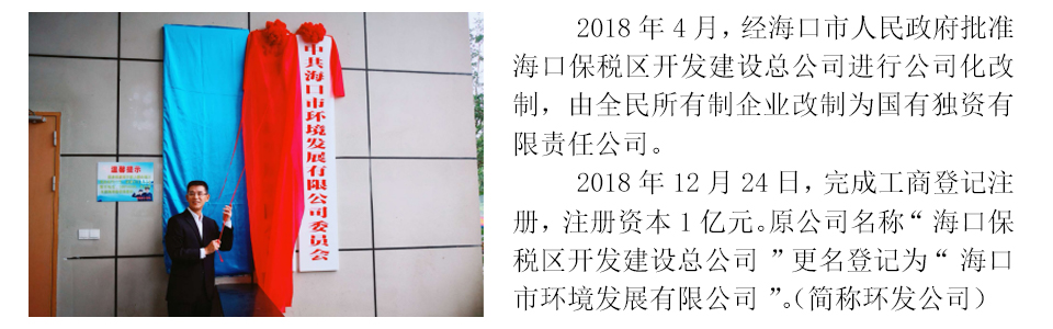海口市環(huán)境發(fā)展有限公司是海口市屬國有獨資有限責任公司,于2018年12月正式掛牌運營,注冊資本1億元,由1993年12月成立的??诒6悈^(qū)開發(fā)建設總公司進行公司化改制而成,核心業(yè)務為環(huán)境環(huán)衛(wèi)產業(yè)投資和運營、資產運營和管理,培育業(yè)務為工程管理